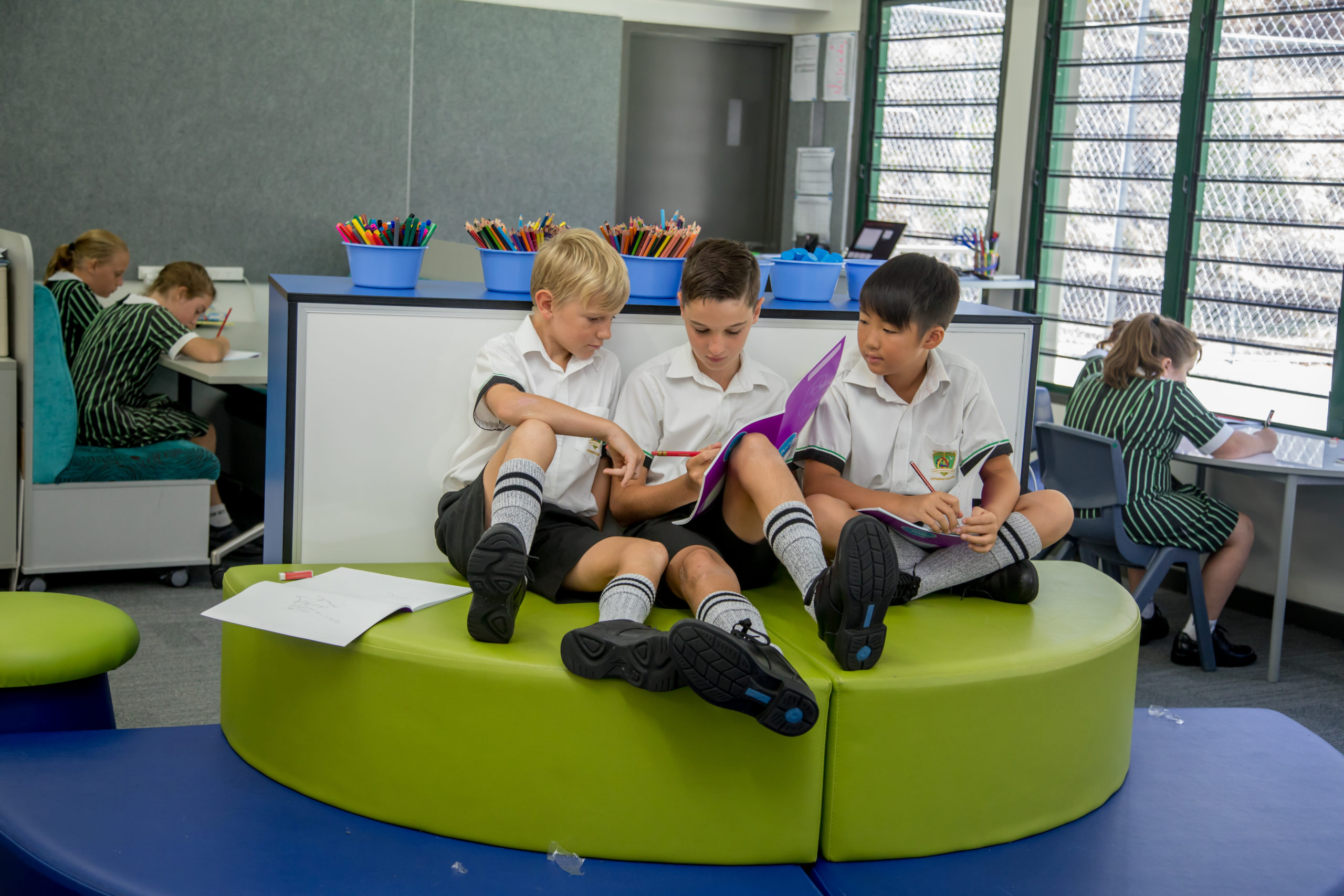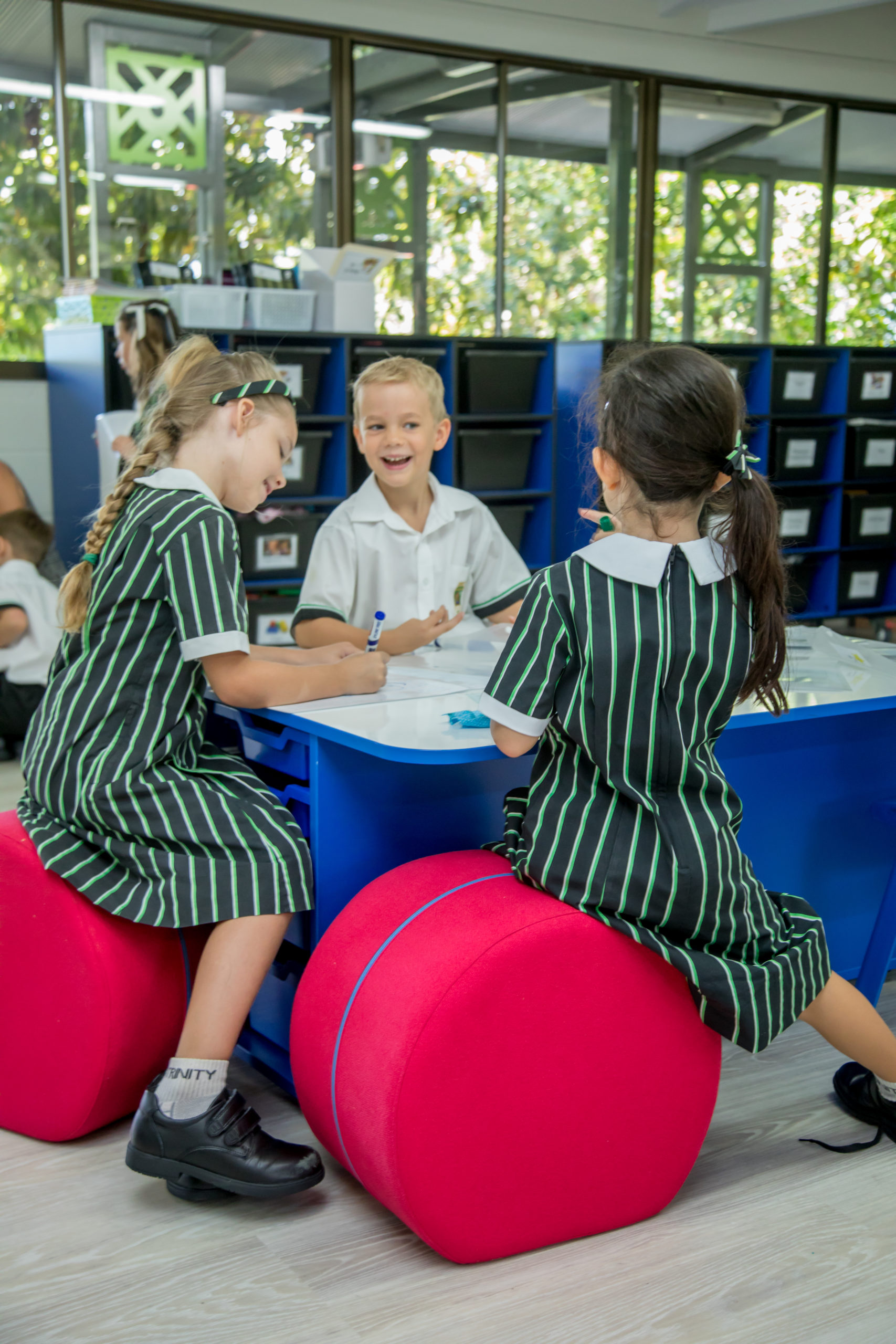 A formal handwriting task will therefore be done at a formal desk and chair, but a research task which has a student talking to a group of people about the question to be answered may be worked on at a high table or on a mat where a group can sit comfortably together. The options will be set up collaboratively by the students and the teachers as they develop their learning intent.